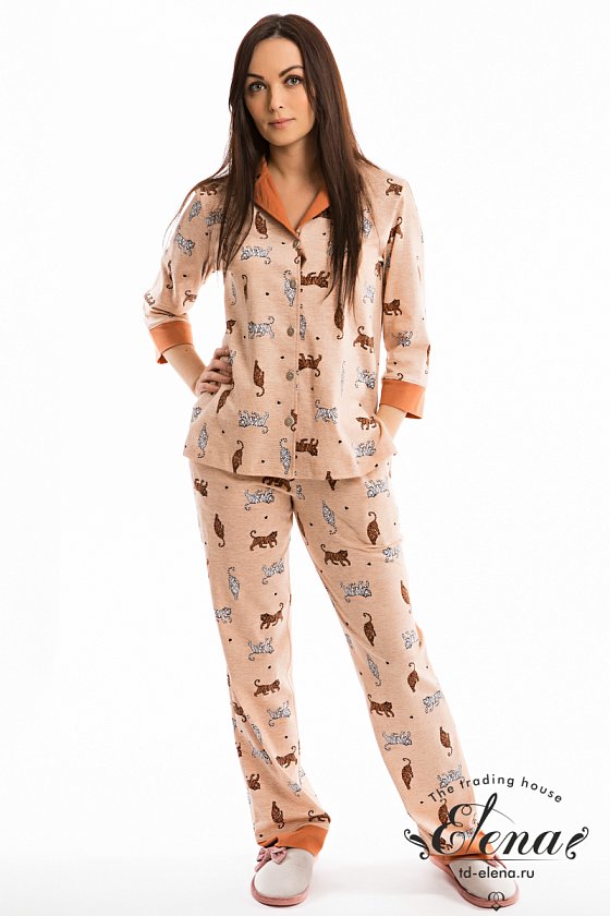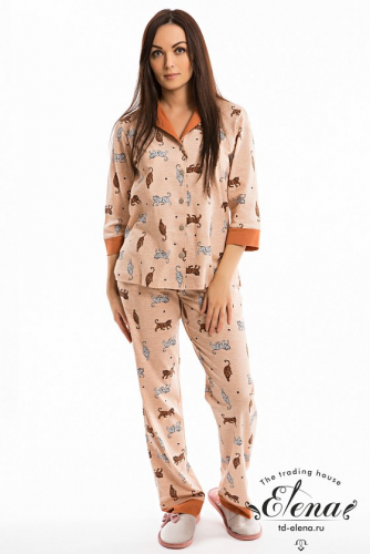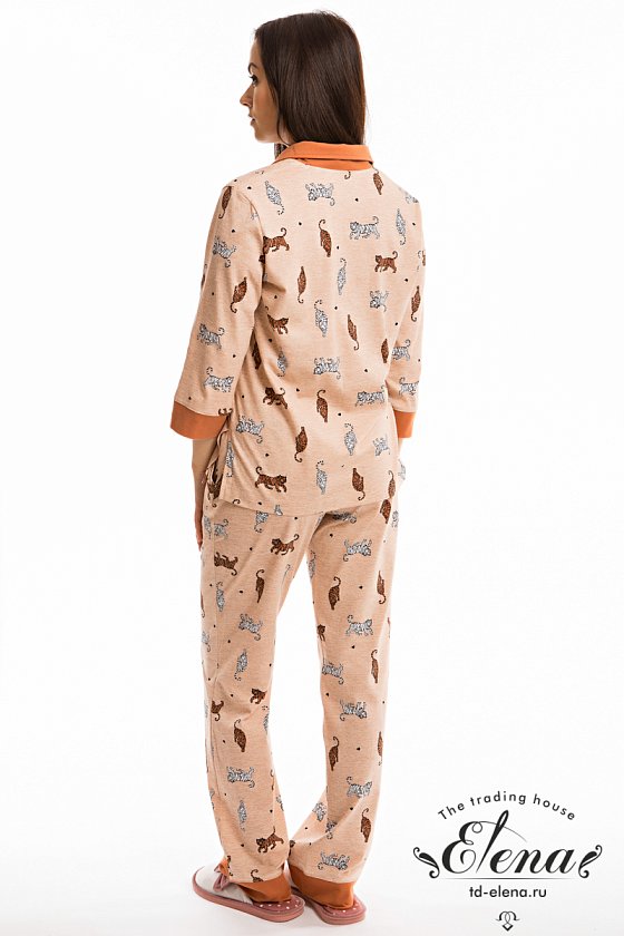 Комплект выполнен из кулирки с набивным рисунком с отделкой из однотонного полотна. Рубашка с отложным воротником и бортами, с рукавом длиной 3/4 и разрезами в боковых швах. Воротник, борта и манжеты рукавов из отделочного полотна. Спереди застёжка на пуговицы. Брюки с боковыми карманами, притачным поясом и отделочными манжетами.