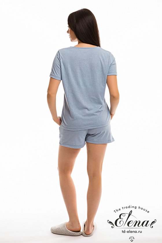 Комплект выполнен из кулирки, 100% хлопок, состоит из шорт и футболки с коротким втачным рукавом. Шорты с боковыми карманами и притачным поясом на резинке. Футболка с принтом спереди, круглый вырез горловины обработан бейкой.
