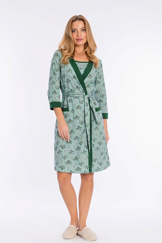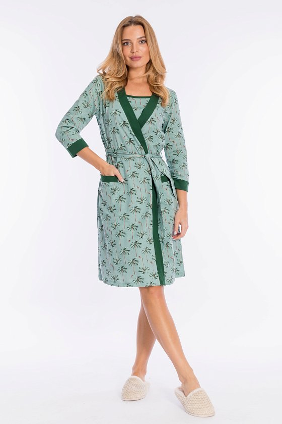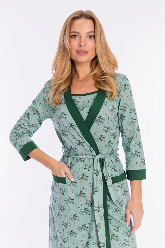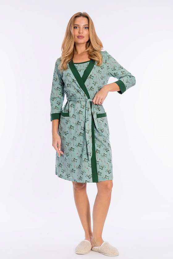 Комплект домашний состоит из халата и сорочки, выполненных из кулирки, 100% хлопок. Халат на запах, с втачным рукавом длиной 3/4. Планки по борту, низу рукавов и на карманах из отделочного полотна. Сорочка на тонких бретелях.
