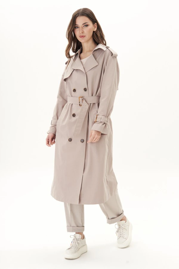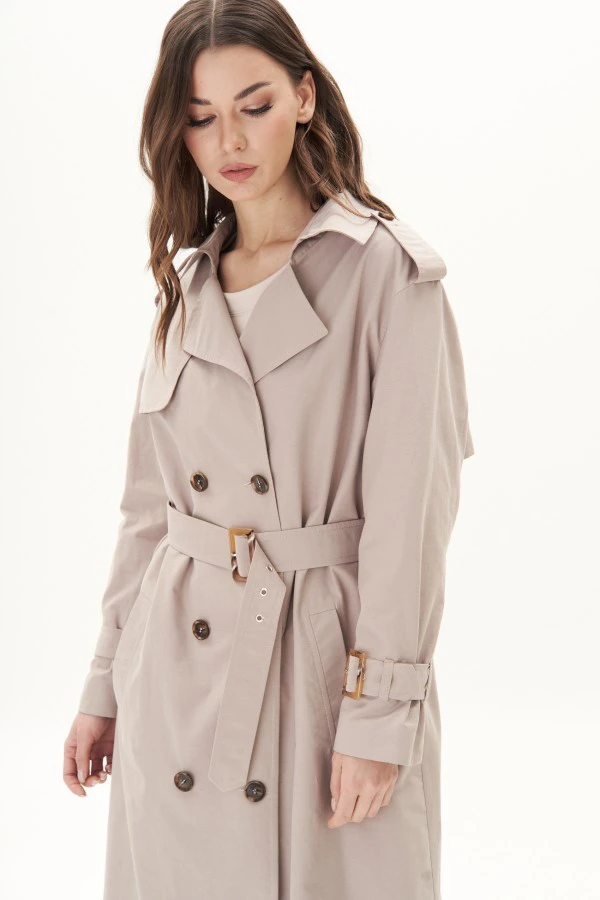 Плащи не выходят из моды на протяжении даже не нескольких лет, а нескольких десятилетий. В современном мире это не просто защита от дождя и ветра, плащ-стильный предмет гардероба, который сам по себе целый образ.Свободный у прямлённый силуэт со слегка заниженной линией плеча, рубашечный покрой рукава, двубортной застёжкой и капюшоном. На полочке прорезные карманы с листочкой.Спинка со средним швом, отлётной кокеткой и шлицей в нижней части. Рукав двухшовный с отделочной регулирующей патой и пряжкой в нижней части. По линии талии шлёвки и съёмный пояс с отделочной пряжкой. Застёжка на два ряда пуговиц. По правой полочке-отлётная кокетка.Длина изделия около 110 см.Длина рукава с плечом 75 см. Подкладка 100% ПЭ