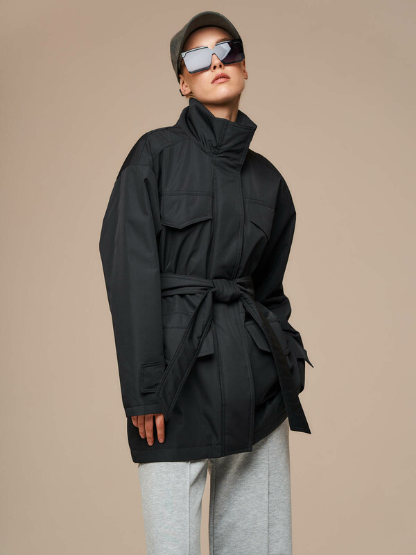 Детали: застежкака на молнию и потайные кнопки, декоративные паты, в комплекте пояс из основной ткани