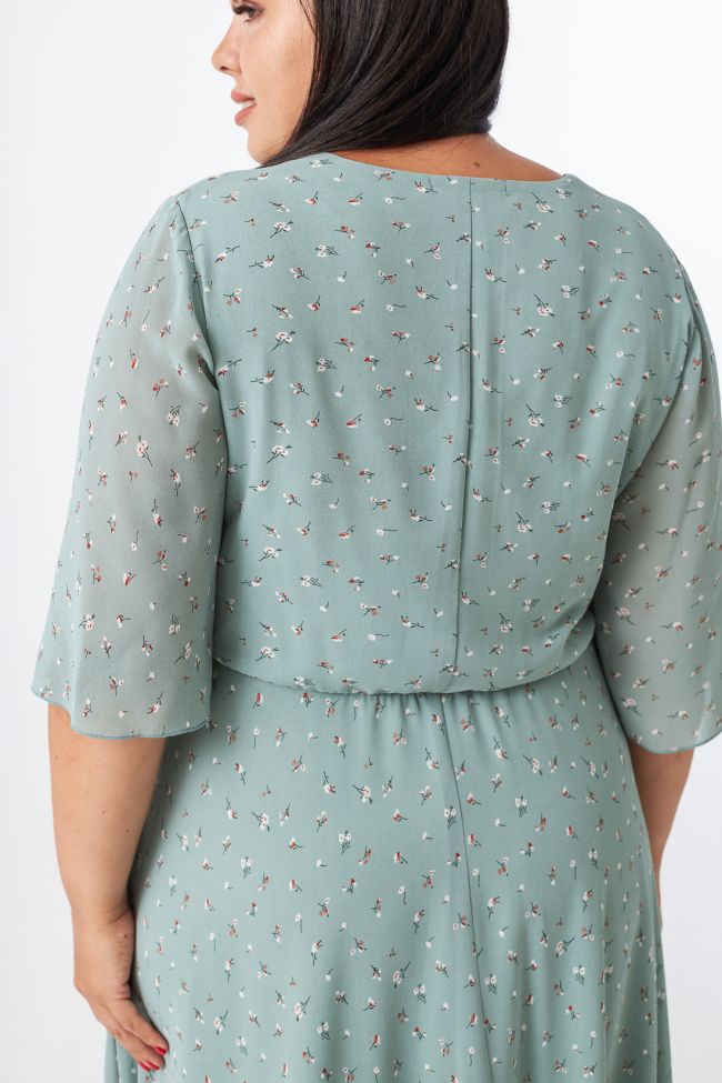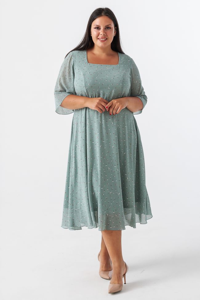 светло-зеленый Женственное платье приталенного силуэта из легкого шифона в мелкий принт. Модель на трикотажной подкладке. Вырез горловины - фигурное "карэ», открывает зону декольте подчеркивая линию шеи и плеч. Втачные  укороченные рукава с расклешением книзу. Прилегающий лиф подчеркнут вертикальными рельефами, талия на резинке. Низ платья расклешенный, с мягкими складками. Низ изделия и рукавов обработан аккуратным ролевым швом. Женственный силуэт и элегантная длина придают модели романтичности.  Замечательный выбор для выхода и встречи с друзьями.
