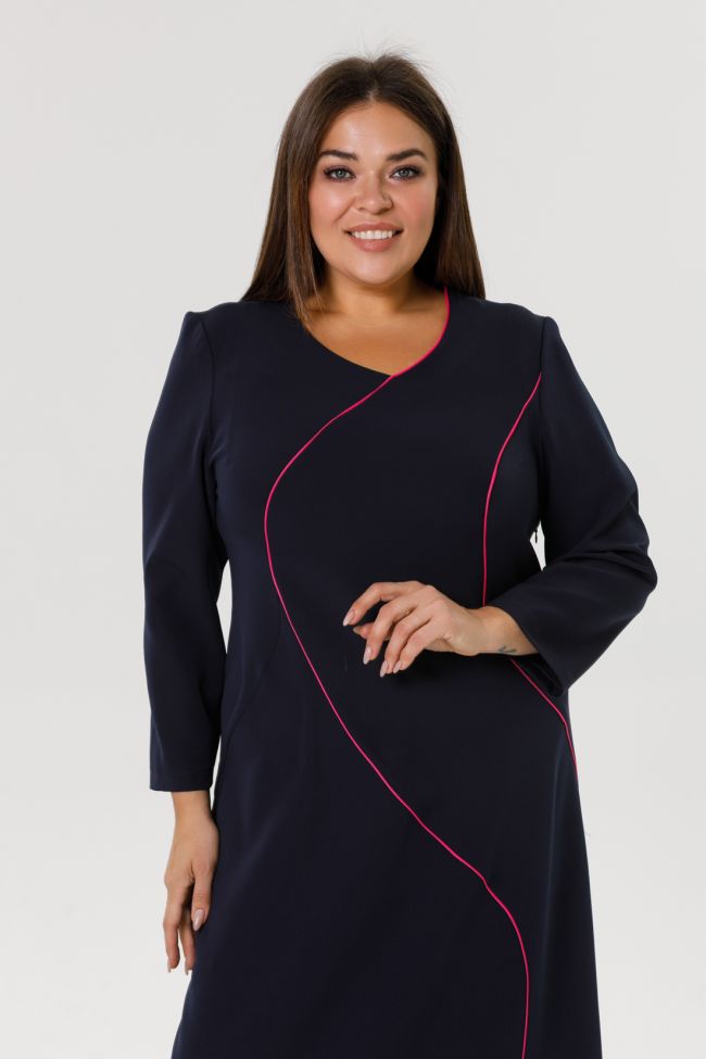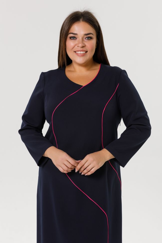 темно-синий Платье полуприлегающего силуэта длиной до линии колен. Модель выполнена из однотонной плательной ткани «Барби». Фигурный  вырез горловины обработан внутренней обтачкой. Прилегание по фигуре за счет фигурных рельефов. В качестве отделки, рельефы оформлены ярким кантом. По спинке средний шов, снизу оканчивающийся шлицей. Слева, в боковом шве, застежка-молния. Рукава  втачные,длиной 7/8. Низ ровный.