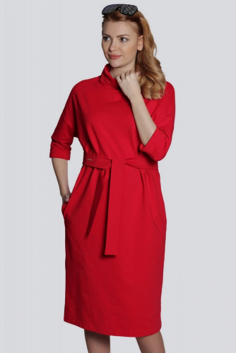 Элегантное офисное платье свободного объема имеет покрой со спущенной линией плеч. Платье отлично сидит на фигуре любого типа телосложения, пояс подчеркивает линию талии. Воротник мягкая стойка и манжеты на рукавах придают образу немного строгости. Состав трикотажа: 75% хлопок, 20% полиэстер, 5% спандекс. желтый
