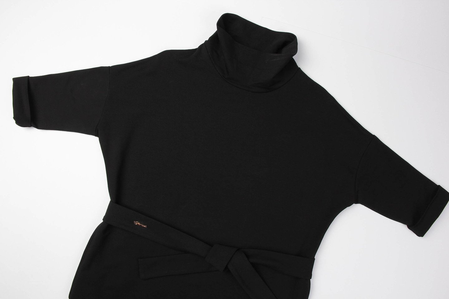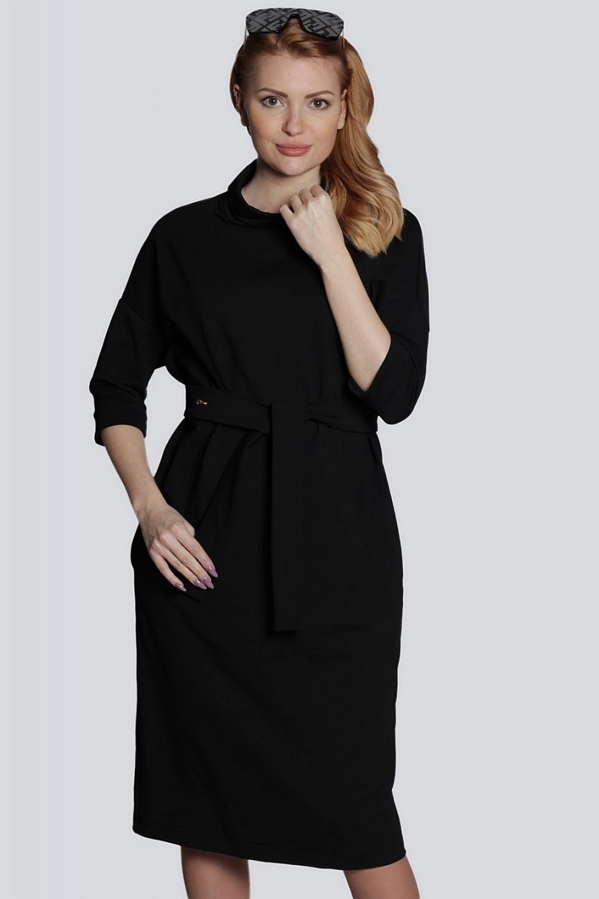 Элегантное офисное платье свободного объема имеет покрой со спущенной линией плеч. Платье отлично сидит на фигуре любого типа телосложения, пояс подчеркивает линию талии. Воротник мягкая стойка и манжеты на рукавах придают образу немного строгости. Состав трикотажа: 75% хлопок, 20% полиэстер, 5% спандекс. черный