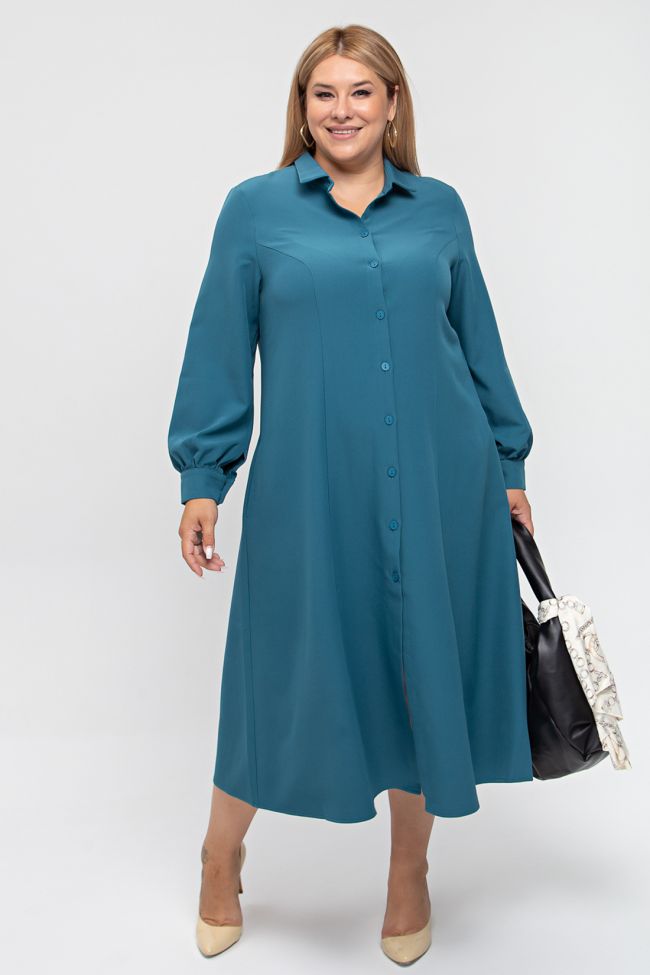 сине-зеленый Платье свободного силуэта из костюмно-плательной ткани. По спинке и переду вертикальные рельефы. Горловина оформлена отложным воротником на притачной стойке. По переду планка по всей длине изделия, с застежкой на петли и пуговицы.  Втачной рукав по низу  присобран на манжету. Низ прямой. В боковых швах удобные карманы.