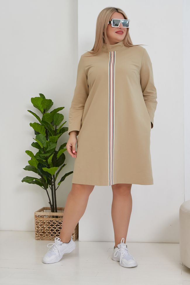 бежевый Комфортное платье в спортивном стиле, прямого силуэта длиной за линию колен. Модель выполнена из плотного трикотажного полотна. Прилегание по груди за счет вытачек. Круглый вырез горловины оформлен воротником - стойкой. В виде отделки по центру переда декоративная тесьма. По спинке средний шов оканчивающийся застежкой молнией. В боковых швах удобные карманы. Рукава длинные втачные. Низ ровный. Платье прекрасно дополнит повседневный гардероб в прохладное время года.