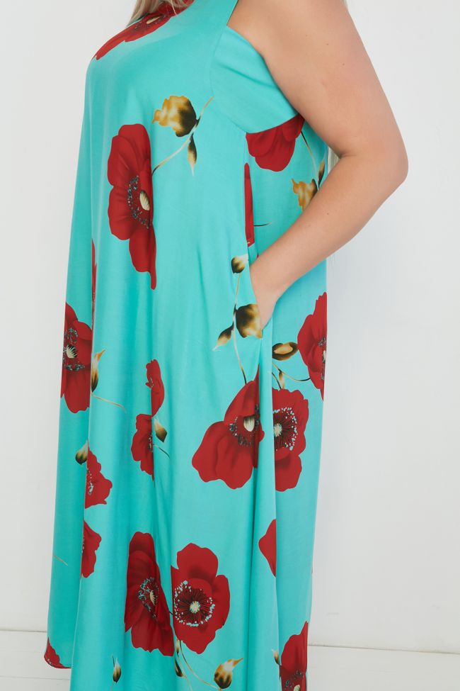 бирюзовый Яркое удлиненное платье А - образного силуэта на широких бретелях, длиной чуть выше щиколотки. Модель выполнена из хлопковой ткани с принтом «цветы». В области проймы оригинальные однотонные вставки из трикотажной ткани. В боковых швах удобные карманы, низ ровный. Комфортная модель для летнего образа отлично скрывающая все недостатки фигуры.