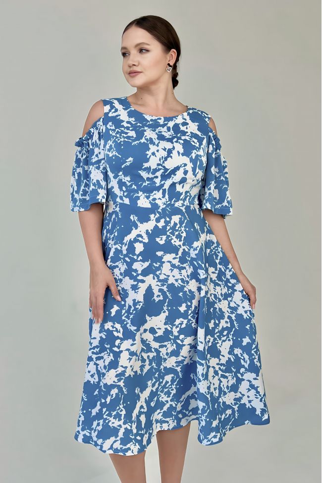 голубой Женственное платье полуприлегающего силуэта, длиной за линию колен. Модель выполнена из плательной принтованной ткани. Лиф отрезной, обтачной подкладкой. Прилегание по груди за счет рельефов. Талия по спинке присобрана на резинку. Вырез горловины круглый. Рукава укороченной длины, верх рукава с открытой линией плеча. Низ изделия расклешенный. Модель прекрасно дополнит летний повседневный образ.