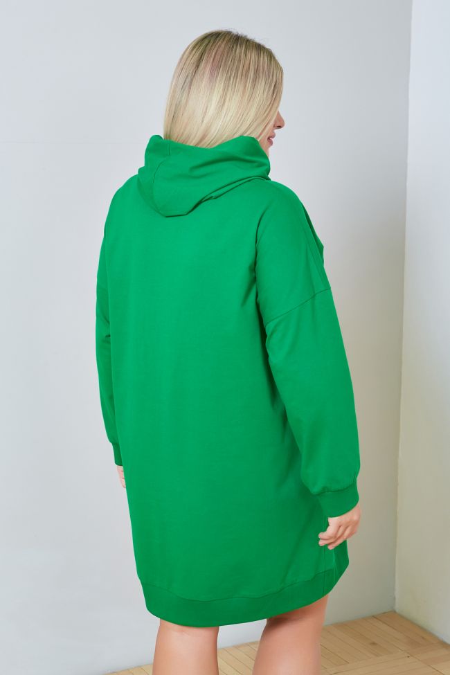 зеленый Комфортное платье в спортивном стиле прямого силуэта, из плотного однотонного трикотажа. Круглый вырез горловины оформлен капюшоном. Рукава длинные втачные на спущенной линии плеча. Низ изделия и рукава оформлены притачной широкой манжетой. В боковых швах удобные карманы. Низ ровный. Отличный вариант в тренде нынешней моды для ценителей комфорта.