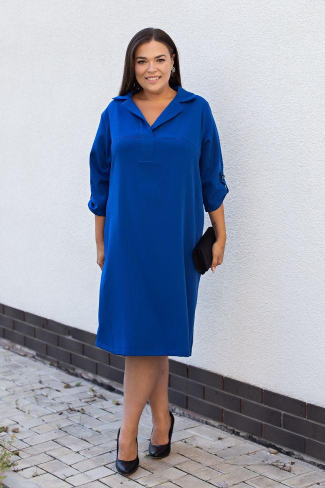 синий Платье свободного силуэта из плательной ткани "Барби". V-образный вырез горловины дополнен отложным воротником, переходящим в планку. По переду отрезная горизонтальная кокетка и вертикальные рельефы с сужением к низу. По спинке отрезная кокетка, дополнена мелкими складками и центральным швом, имитирующим застежку, с пуговицами по всей длине. В боковых швах удобные карманы. Втачные рукава, длиной 3/4 дополнены патой на пуговице. Низ ровный.