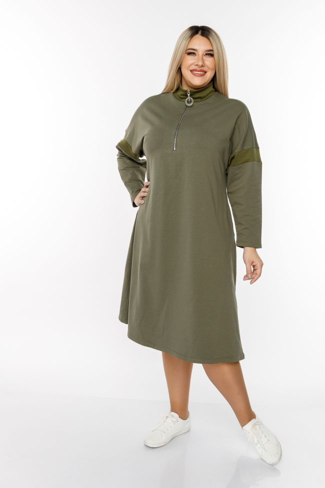 хаки Комфортное платье А - силуэта, длиной за линию колен. Модель выполнена из плотного трикотажа. Прилегание по груди за счет вытачек. Длинный рукав на спущенной линии плеча. Круглый вырез горловины оформлен воротником-стойка, по центру переда застежка-молния до линии груди. В боковых швах удобные карманы. Низ ровный. Модель станет отличным дополнением повседневного гардероба в прохладное время года.