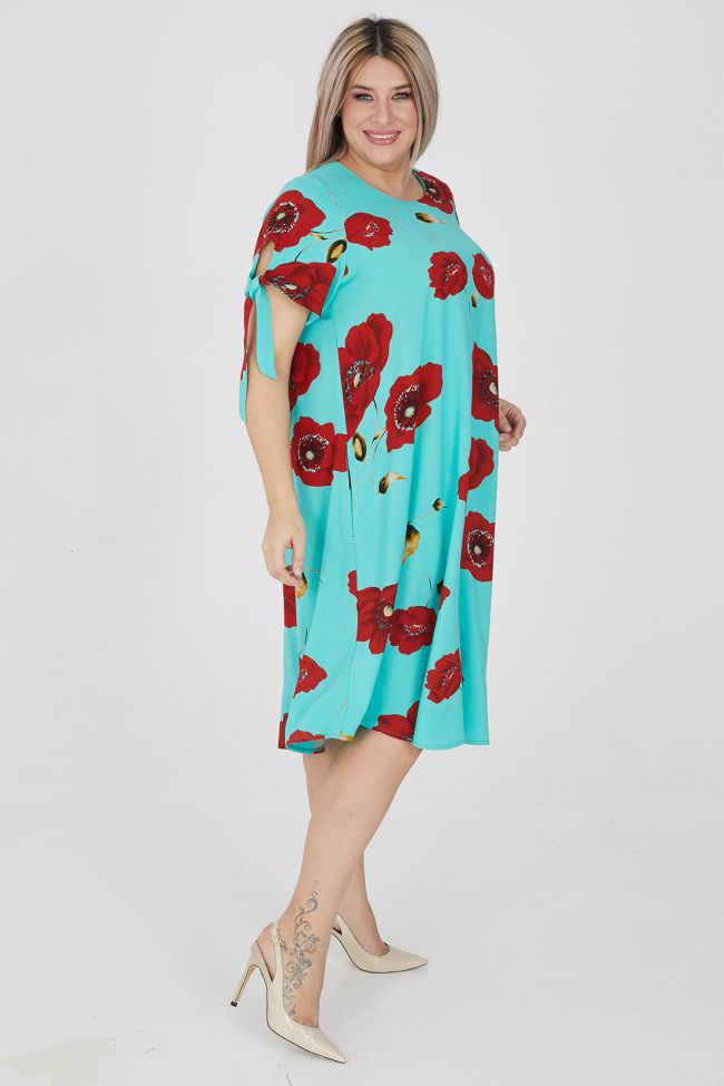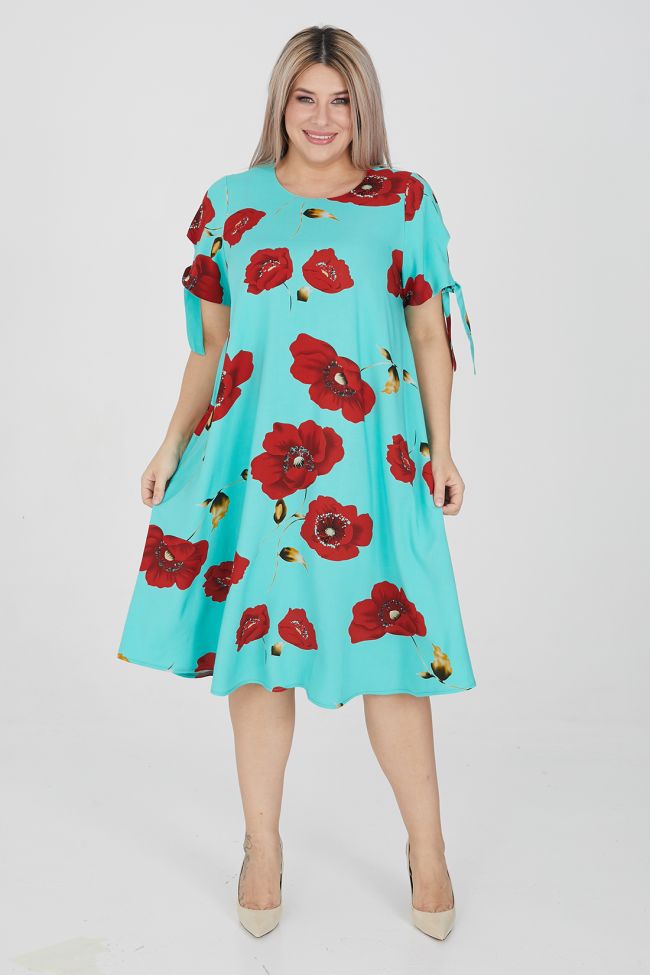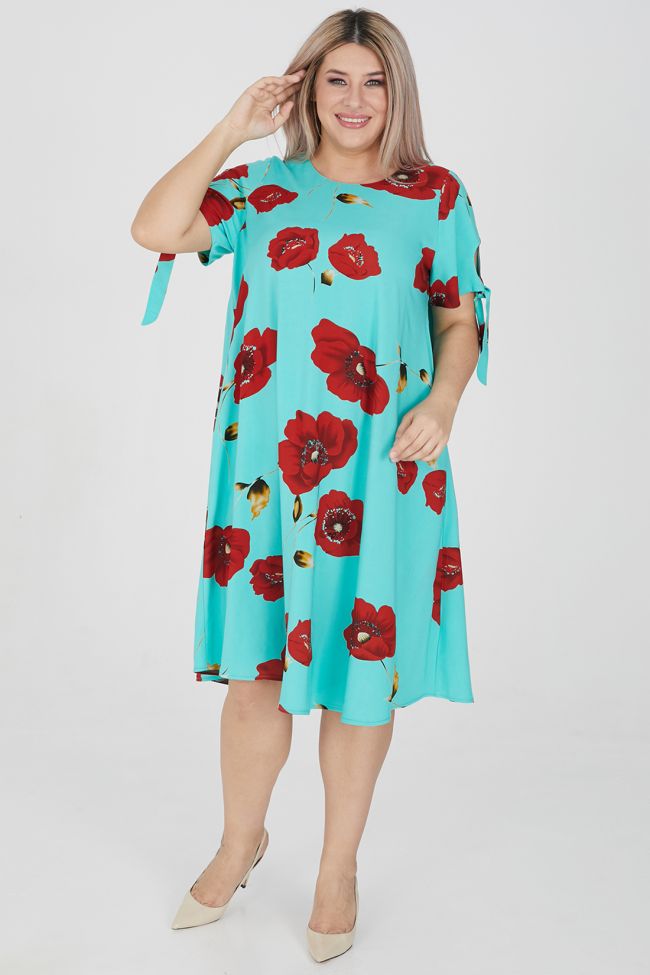 бирюзовый Комфортное платье А-образного силуэта из плательной ткани в яркий принт. Круглый вырез горловины обработан внутренней обтачкой. Спинка со средним швом, вверху оканчивающимся разрезом с застежкой на петлю и пуговицу. В боковых швах удобные карманы. Втачные укороченные рукава с круглым вырезом, по низу дополнены завязками. Женственное, легкое платье станет прекрасным дополнением вашего летнего гардероба.
