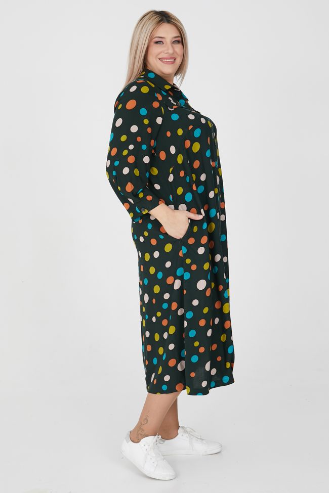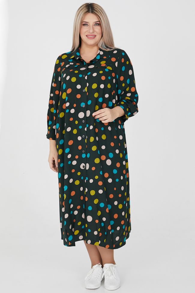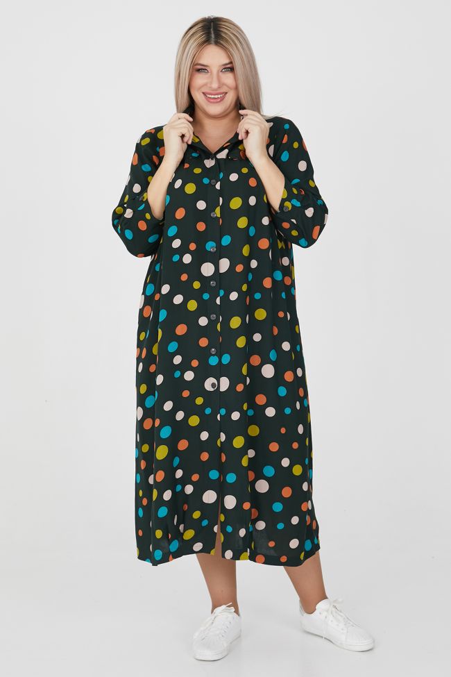 темно-зеленый Платье прямого силуэта из штапельной ткани в «яркий горох». Прилегание по груди за счет вытачек. По линии груди декоративные элементы в виде клапанов с пуговицей. Горловина оформлена отложным воротником на притачной стойке. По переду планка по всей длине изделия, с застежкой на петли и пуговицы. Втачной рукав длиной 7\8 по низу оформлен двумя складками, придающими небольшой объем. В боковых швах удобные карманы. Низ прямой. Стильный, удобный вариант для летних прогулок.