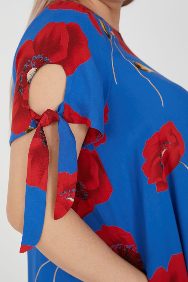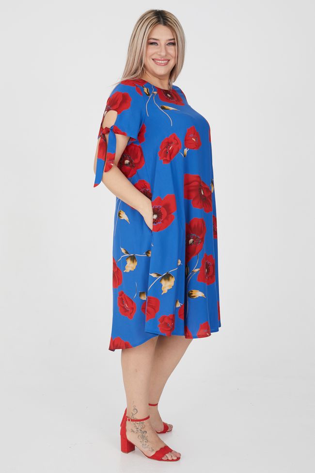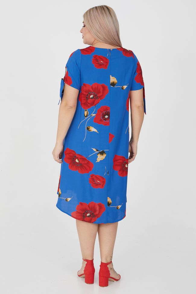 синий Комфортное платье А-образного силуэта из плательной ткани в яркий принт. Круглый вырез горловины обработан внутренней обтачкой. Спинка со средним швом, вверху оканчивающимся разрезом с застежкой на петлю и пуговицу. В боковых швах удобные карманы. Втачные укороченные рукава с круглым вырезом, по низу дополнены завязками. Женственное, легкое платье станет прекрасным дополнением вашего летнего гардероба.