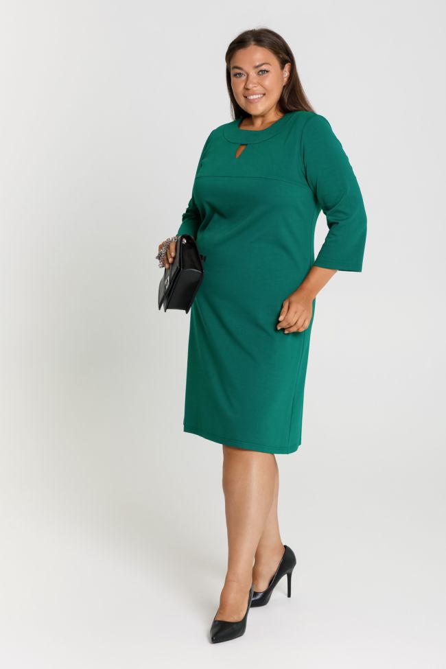 зеленый Стильное платье полуприлегающего силуэта из трикотажного полотна однотонной расцветки. Удобные втачные рукава длиной ¾. По всей длине спинки эффектный замок. По переду горловины элегантный вырез капелька, полоненный украшением. Прекрасный выбор на каждый день!