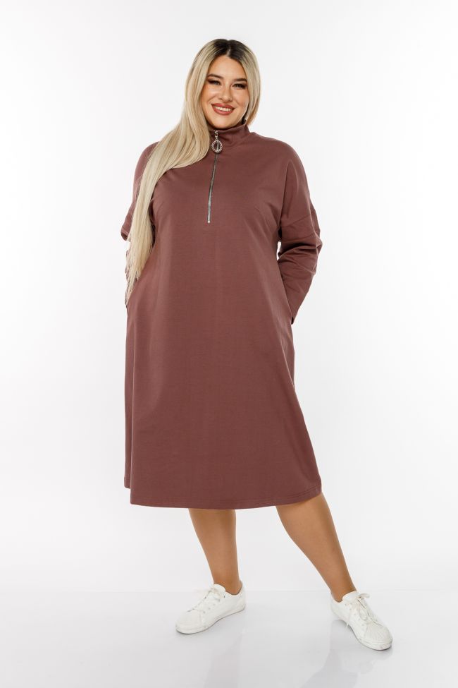 капучино Комфортное платье А - силуэта, длиной за линию колен. Модель выполнена из плотного трикотажа. Прилегание по груди за счет вытачек. Длинный рукав на спущенной линии плеча. Круглый вырез горловины оформлен воротником-стойка, по центру переда застежка-молния до линии груди. В боковых швах удобные карманы. Низ ровный. Модель станет отличным дополнением повседневного гардероба в прохладное время года.
