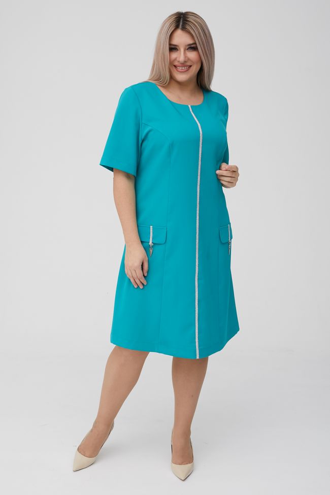 бирюзовый Комфортное платье  А- образного  силуэта из плательной ткани "Барби". Круглый вырез горловины обработан внутренней обтачкой. По переду и спинке вертикальные рельефы. Перед дополнен фигурными клапанами, в виде отделки по центру переда и клапанам декоративная тесьма. Спинка со швом по центру, с застежкой на тесьму молнию. Втачные рукава укороченной длины. Низ ровный, без разрезов.