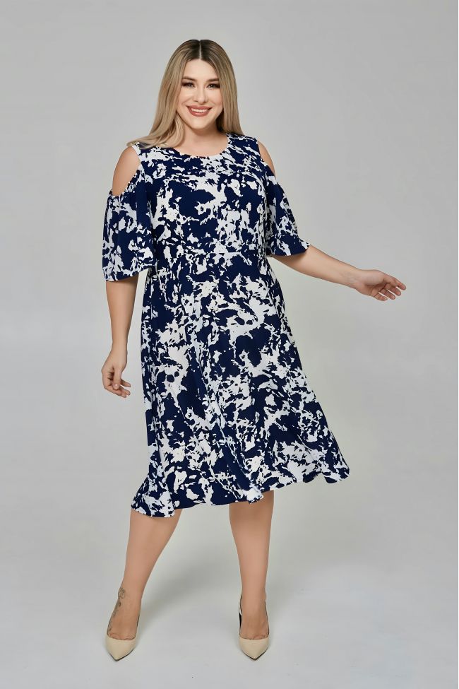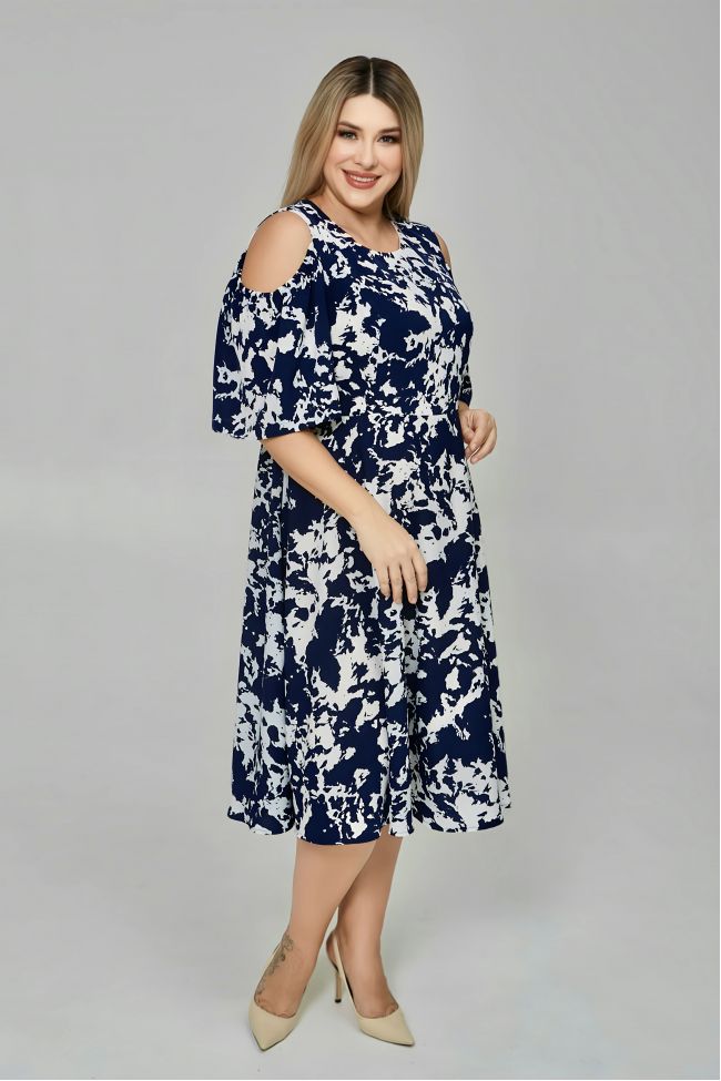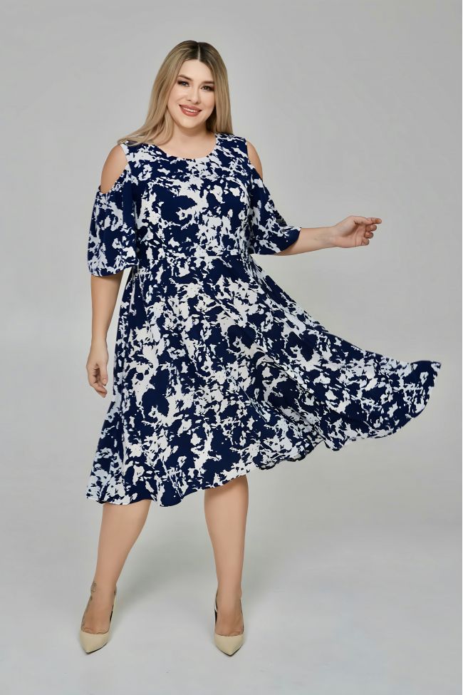 темно-синий Женственное платье полуприлегающего силуэта, длиной за линию колен. Модель выполнена из плательной принтованной ткани. Лиф отрезной, обтачной подкладкой. Прилегание по груди за счет рельефов. Талия по спинке присобрана на резинку. Вырез горловины круглый. Рукава укороченной длины, верх рукава с открытой линией плеча. Низ изделия расклешенный. Модель прекрасно дополнит летний повседневный образ.