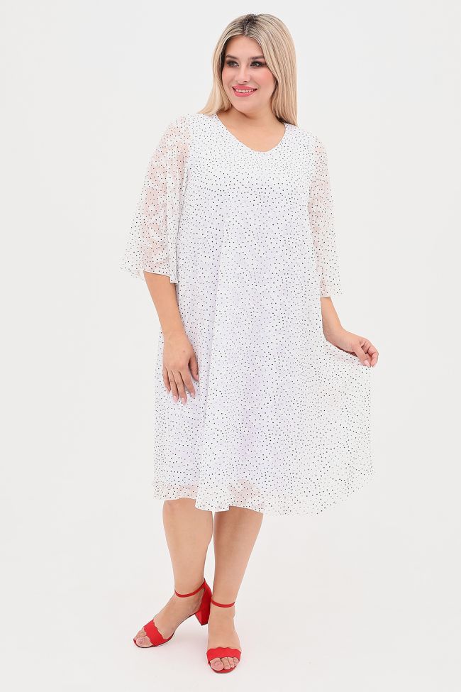 белый Женственное платье A-образного силуэта из шифона с вытравным рисунком, на трикотажной подкладке. V-образный вырез горловины позволяет украсить зону декольте любым украшением.  Рукава втачные расклешенные,  длиной 7/8. Легкое платье обеспечит свободу движений и поможет создать легкий романтичный  образ.
