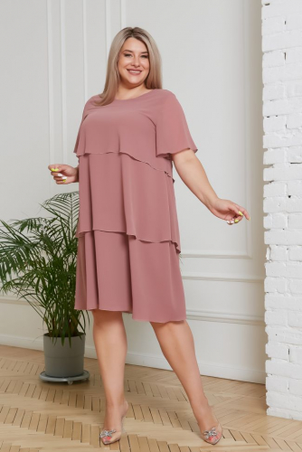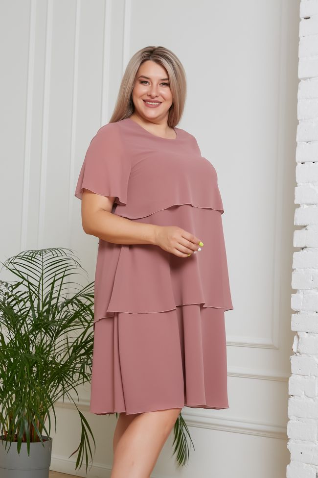 пудровый Женственное многоярусное платье А-силуэта, длиной за колено. Модель выполнена из однотонного шифона на подкладке. Круглая горловина обработана подкладкой. Рукава втачные укороченные, расклешенные. Низ ярусов и рукавов обработан ролевым швом. Комфортное легкое платье отлично скрадывает недостатки фигуры.