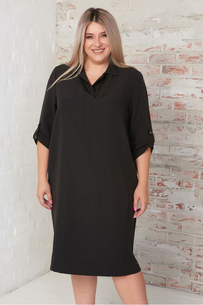 черный Платье свободного силуэта из плательной ткани "Барби". V-образный вырез горловины дополнен отложным воротником, переходящим в планку. По переду отрезная горизонтальная кокетка и вертикальные рельефы с сужением к низу. По спинке отрезная кокетка, дополнена мелкими складками и центральным швом, имитирующим застежку, с пуговицами по всей длине. В боковых швах удобные карманы. Втачные рукава, длиной 3/4 дополнены патой на пуговице. Низ ровный.