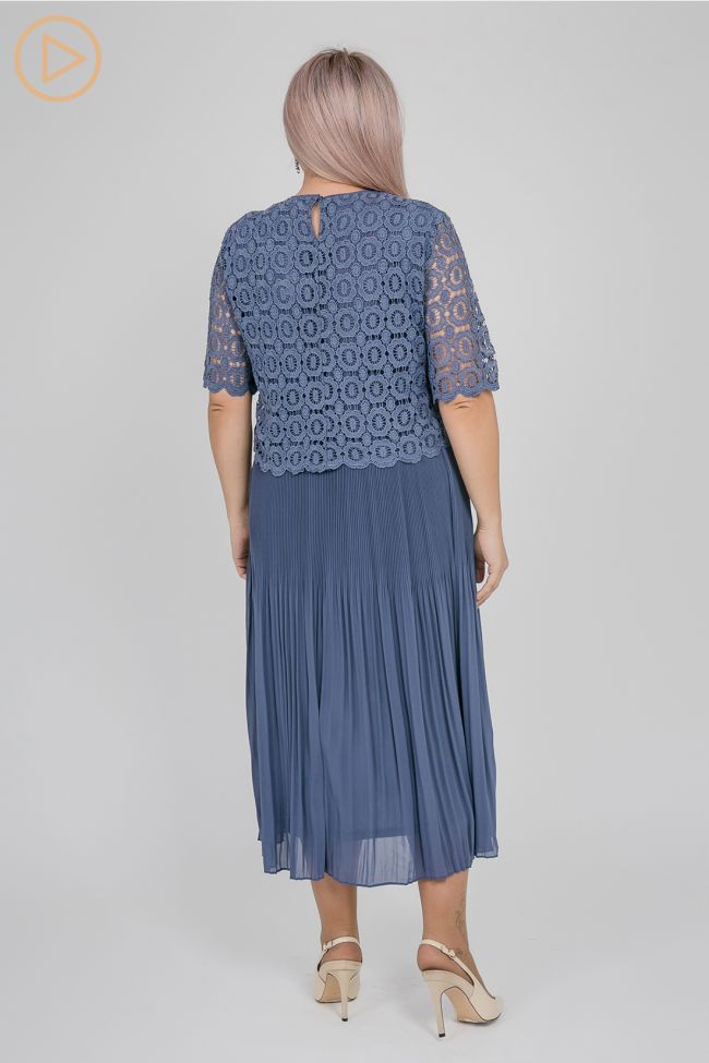 голубой Нарядное длинное платье. Перед и спинка с отрезной линией талии. Лиф двойной - верхний слой переда и спинки отлетной длиной до линии талии, выполнен из кружева. Втачные кружевные рукава укороченной длины. Лиф и рукава по нижнему срезу оформлены фестонами. Нижний слой лифа - трикотаж в тон с притачной юбкой из плиссе на подкладке. Слои соединены между собой по горловине. В среднем шве спинки застежка на петлю и пуговицу. Отличный вариант для торжественных случаев.