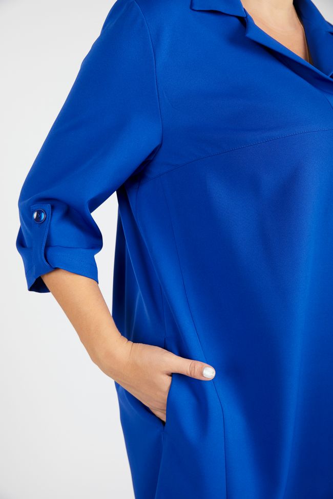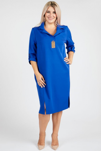 синий Платье свободного силуэта из плательной ткани "Барби". V-образный вырез горловины дополнен отложным воротником, переходящим в планку с декором из мелких страз. По переду отрезная горизонтальная кокетка и вертикальные рельефы с сужением к низу, дополнены разрезами. По спинке отрезная кокетка, дополнена мелкими складками и центральным швом, имитирующим застежку. В боковых швах удобные карманы. Втачные рукава, длиной 3/4 дополнены патой на пуговице. Низ ровный.