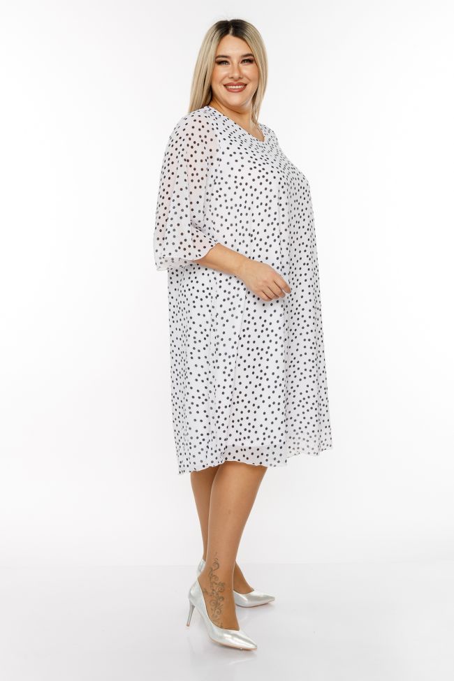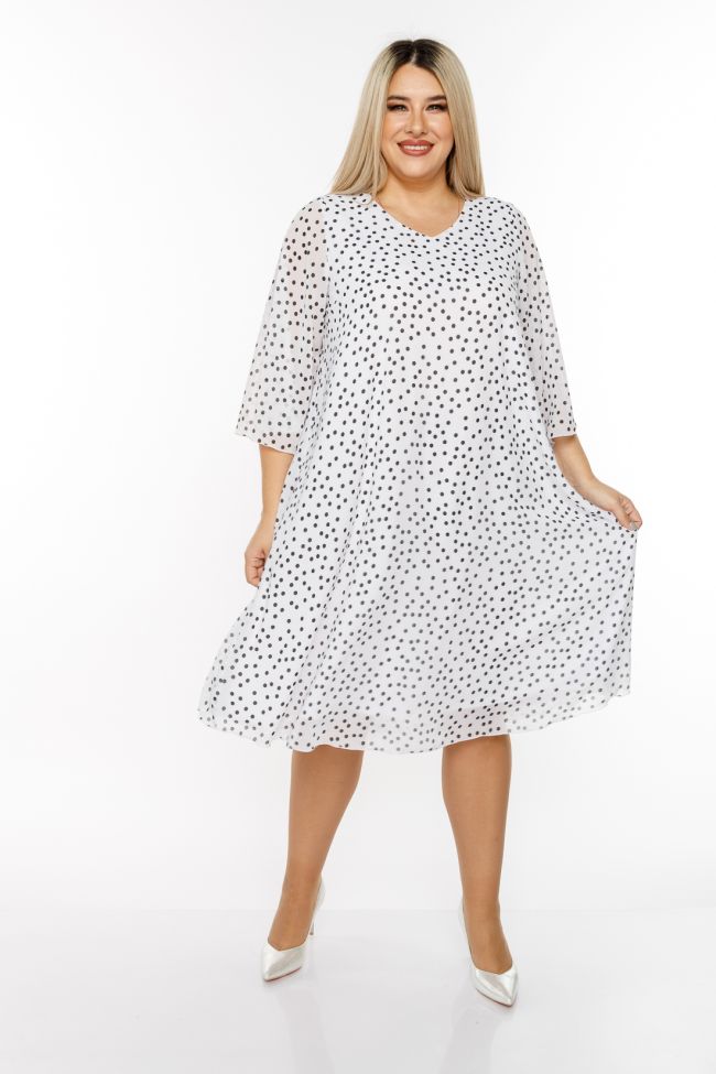 белый Женственное платье A-образного силуэта из шифона с вытравным рисунком, на трикотажной подкладке. V-образный вырез горловины позволяет украсить зону декольте любым украшением.  Рукава втачные расклешенные,  длиной 7/8. Легкое платье обеспечит свободу движений и поможет создать легкий романтичный  образ.