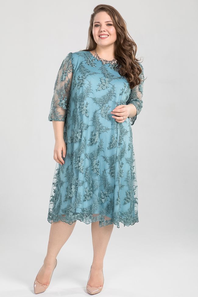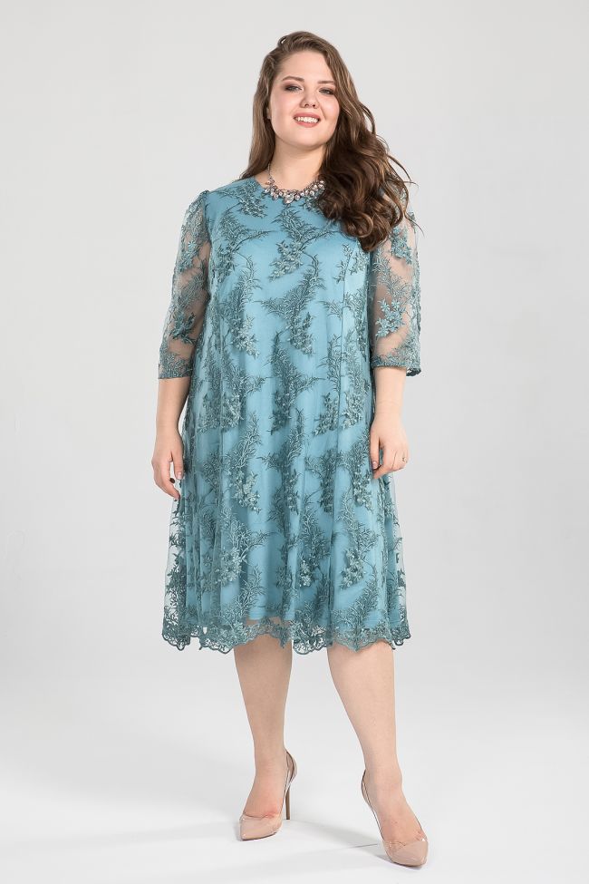 сине-зеленый Праздничное, комбинированное платье А-образного силуэта. Верх из кружевного полотна, нижний слой из трикотажного полотна. Силуэтная форма решена за счет рельефных швов переда и спинки. Спинка разрезная, в шве застежка на тесьму-молнию. Круглый вырез  горловины обработан внутренней обтачкой. Втачные рукава  из кружева, длиной за локоть. Платье поможет создать интересный вечерний образ.