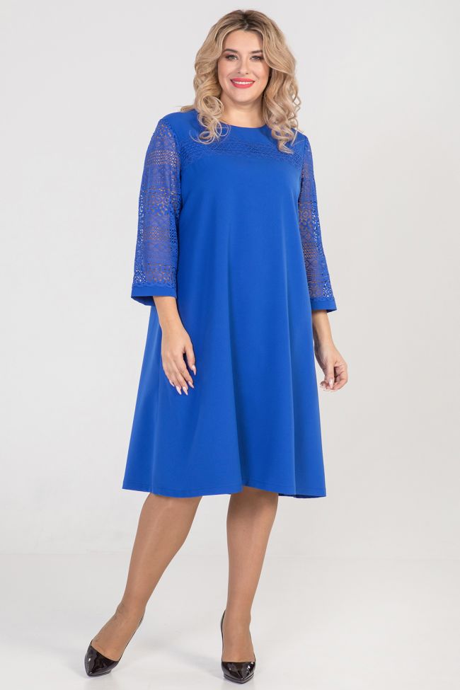 синий Женственное комбинированное платье А-образного силуэта. Модель выполнена из костюмно-плательной ткани "Барби". Перед с отрезной кокеткой, дополнен широкой  кружевной вставкой дублированной тканью в цвет основы. Спинка со швом по центру, с застежкой на тесьму - молнию. Круглая горловина, обработана внутренней обтачкой. Втачные рукава из кружевного полотна, по низу дополнены узкой манжетой. Низ изделия ровный, слегка расклешенный. Отличный выбор для торжественных случаев.