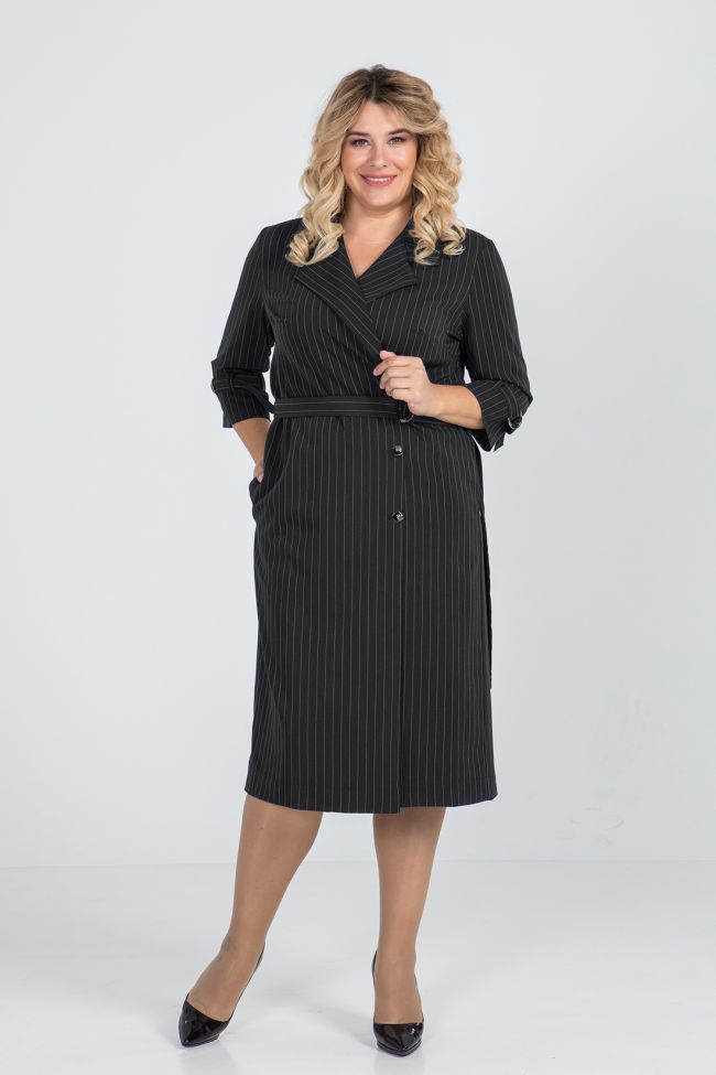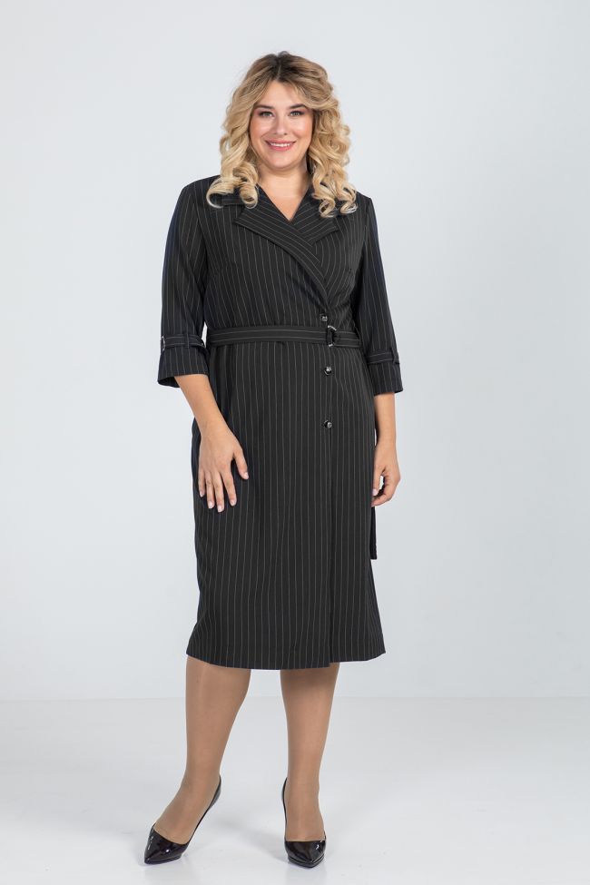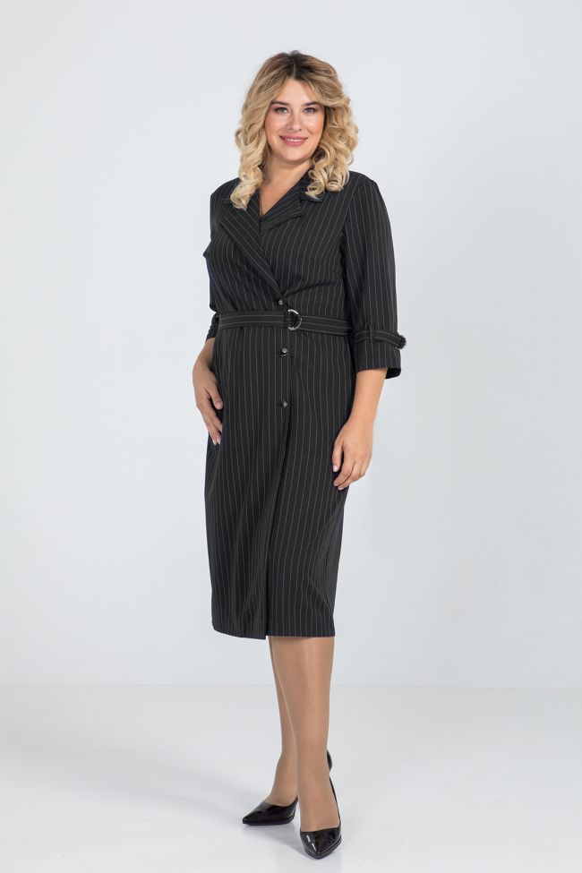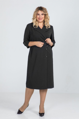 черный Платье полуприлегающего силуэта из костюмной  ткани. По переду  двубортная застежка на петли и пуговицы, левый борт с внутренней застежкой на эластичную тесьму и пуговицу. Воротник - английский, прилегание по груди за счет вытачек. Линию талии подчеркивает пояс  с застежкой на полукольца. Спинка со швом по центру, в боковых швах удобные карманы. Втачной рукав, удобной длины 3\4, дополнен  шлевками и хлястиком с полукольцами.
