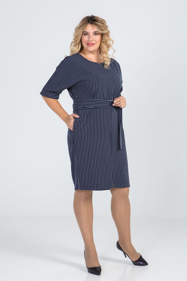 темно-синий Платье полуприлегающего силуэта из  костюмно - плательной ткани "Барби". Перед и спинка с горизонтальным подрезом в области груди, по центру переда шов оканчивающийся разрезом.В боковых швах удобные карманы. Модель с круглым вырезом горловины, обработаным обтачкой. Цельнокроеные рукава  длиной 3/4, с манжетой по нижнему срезу. Линия талии подчеркнута широким поясом в два оборота типа "кушак".