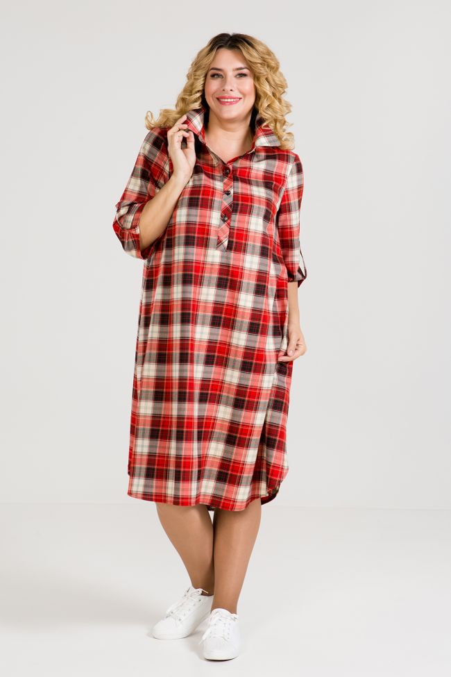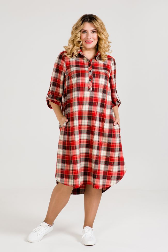 красный Комфортное  платье-рубашка прямого силуэта из костюмной ткани в эффектную клетку.  По центру переда планка с застежкой на петли-пуговицы. Горловина оформлена воротником рубашечного типа. Укороченный втачные рукава оканчиваются подворотом с патой. По груди прилегание за счет вытачек, в боковом шве удобные карманы. Низ ассиметричной длины.