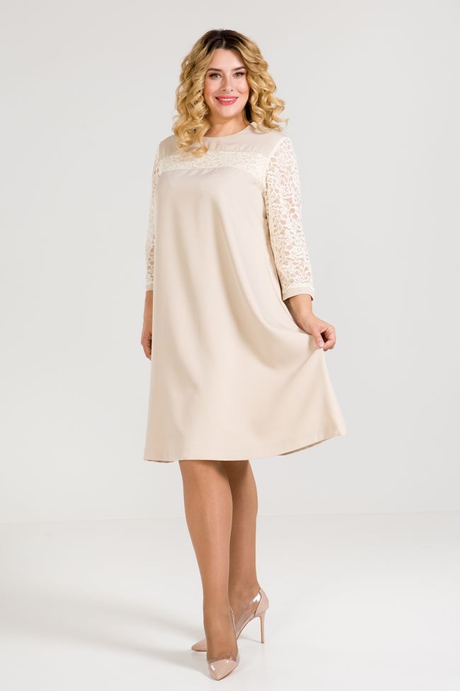 молочный Женственное комбинированное платье А-образного силуэта. Модель выполнена из костюмно-плательной ткани "Барби". Перед с отрезной кокеткой, дополнен широкой  кружевной вставкой дублированной трикотажем телесного цвета. Спинка со швом по центру, с застежкой на тесьму - молнию. Круглая горловина, обработана внутренней обтачкой. Втачные рукава из кружевного полотна, по низу дополнены узкой манжетой. Низ изделия ровный, слегка расклешенный. Отличный выбор для торжественных случаев.