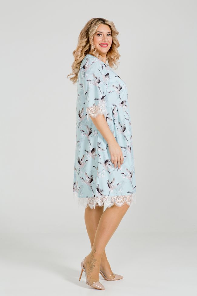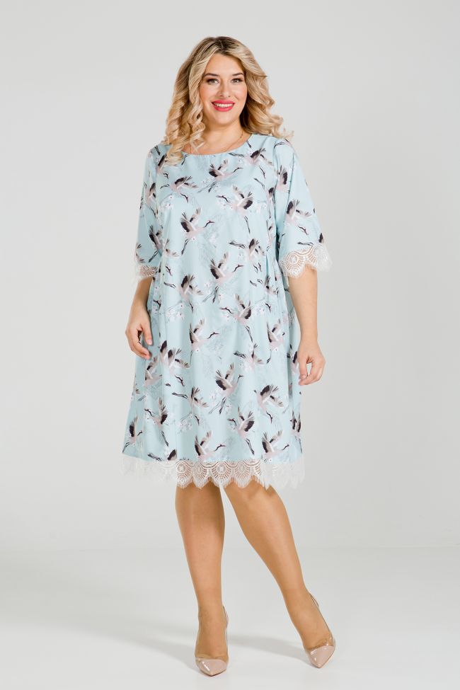 голубой Очаровательное платье свободного силуэта с модным анималистическим принтом. Круглый вырез горловины обработан внутренней обтачкой. Втачные рукава длиной 3/4. По переду подрезной бочок, в области талии заложенный "бантовыми" складками. В боковых швах карманы. Низ изделия и рукава дополнены отделкой в тон из тончайшего кружева. Модель прекрасно подойдет обладательницам любых форм и сделает выход в свет женственным и романтичным.