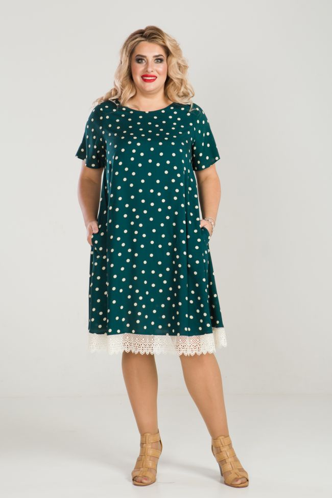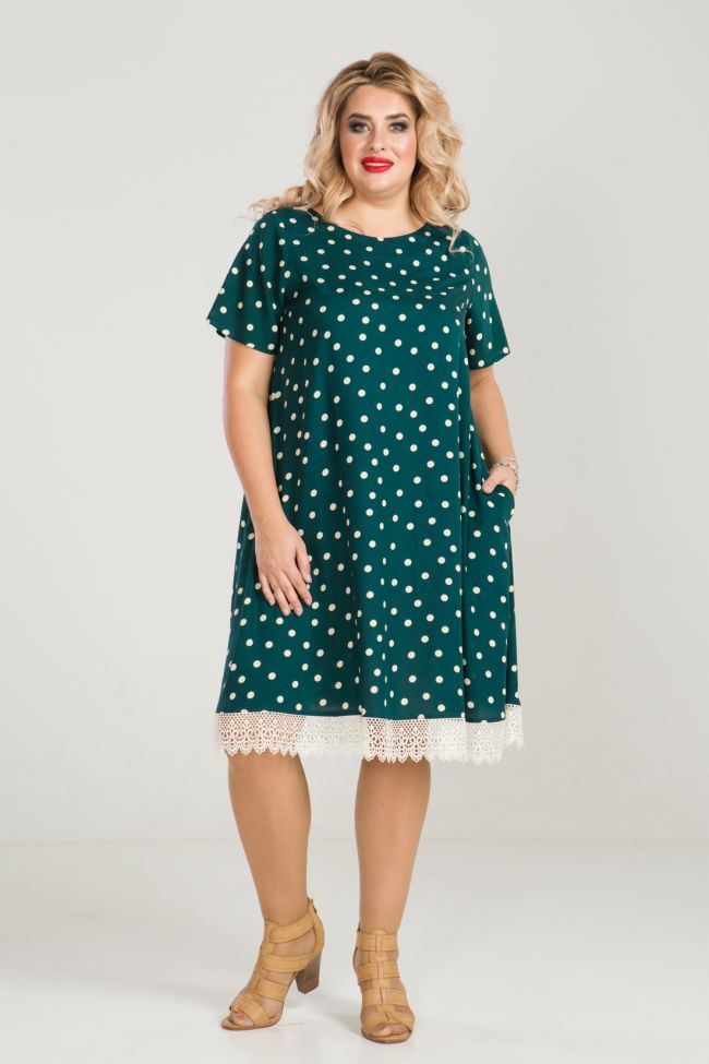 зеленый Платье трапециевидного силуэта длиной за колено. Выполнено из дышащей штапельной ткани с принтом  "горох". Модель имеет простой круглый вырез горловины на внутренней обтачке и короткие втачные рукава. Низ декорирован кружевом. Замечательный выбор для комфортных прогулок.