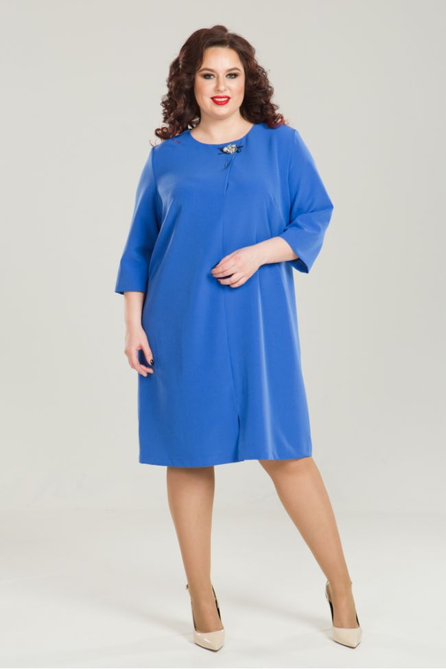 синий Женственное платье прямого силуэта из костюмно - плательной ткани "Барби". Круглый вырез горловины  обработан внутренней обтачкой. По переду центральный шов, снизу оканчивается разрезом, у горловины иммитация складки. Прилегание по груди за счет наклонных вытачек. Спинка разрезная, с застежкой на тесьму-молнию. Втачной рукав, удобной длины, за локоть. Низ ровный.  Платье поможет создать интересный образ для дам любых форм. В комплекте идет модный аксессуар в виде броши.