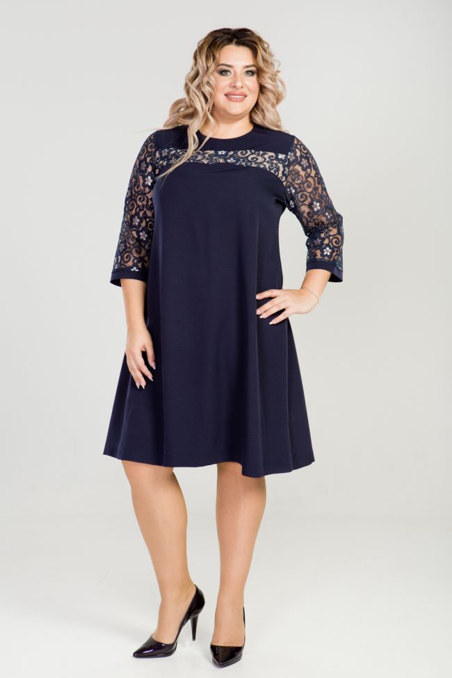 темно-синий Женственное комбинированное платье А-образного силуэта. Модель выполнена из костюмно-плательной ткани "Барби". Перед с отрезной кокеткой, дополнен широкой  кружевной вставкой дублированной трикотажем телесного цвета. Спинка со швом по центру, с застежкой на тесьму - молнию. Круглая горловина, обработана внутренней обтачкой. Втачные рукава из кружевного полотна, по низу дополнены узкой манжетой. Низ изделия ровный, слегка расклешенный. Отличный выбор для торжественных случаев.