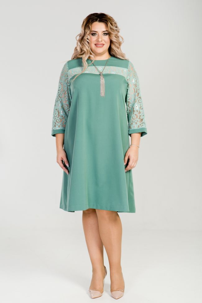 светло-зеленый Женственное комбинированное платье А-образного силуэта. Модель выполнена из костюмно-плательной ткани "Барби". Перед с отрезной кокеткой, дополнен широкой  кружевной вставкой дублированной трикотажем телесного цвета. Спинка со швом по центру, с застежкой на тесьму - молнию. Круглая горловина, обработана внутренней обтачкой. Втачные рукава из кружевного полотна, по низу дополнены узкой манжетой. Низ изделия ровный, слегка расклешенный. Отличный выбор для торжественных случаев.
