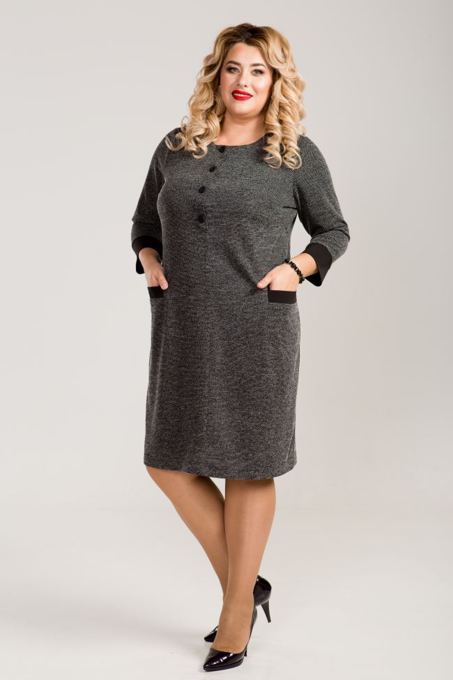 чёрный Элегантное платье полуприлегающего силуэта из трикотажа "меланж". Круглый вырез горловины, по центру переда застежка на петли и пуговицы. Прилегание достигнуто за счет вытачек. По переду удобные горизонтальные карманы с листочкой. Спинка разрезная со шлицей. Втачные рукава удобной длины 3/4. В качестве отделки манжеты рукава и листочки карманов выполнены из однотонной ткани компаньона. Низ ровный. Отличный выбор для деловых встреч и повседневного выхода.