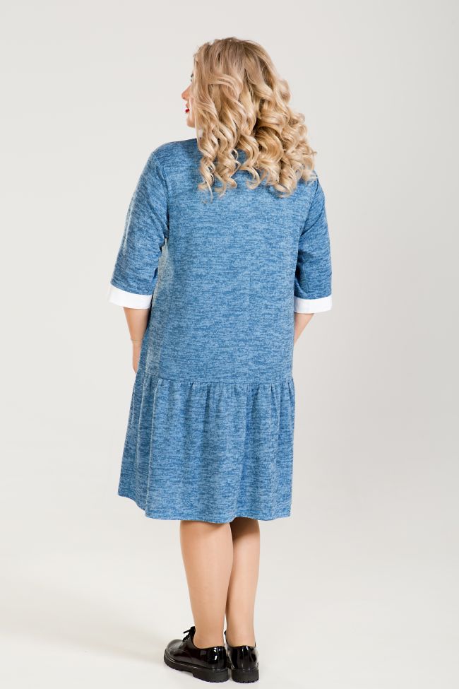 голубой Комфортное платье свободного силуэта из трикотажного полотна в мелкий принт. Спущенное плечо на прямоугольной пройме, укороченный рукав ¾ дополнен белой манжетой из хлопковой ткани. Застежка по горловине спинки на пуговицу. Элегантный отложной воротник белого цвета из хлопка. Отрезная линия талии и бедра дополнена мелкой сборкой. Для удобства в боковом шве расположены карманы. Низ расклешен, подол ровный, без разрезов. Платье обеспечит свободу движений и поможет создать легкий повседневный образ.