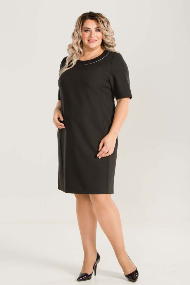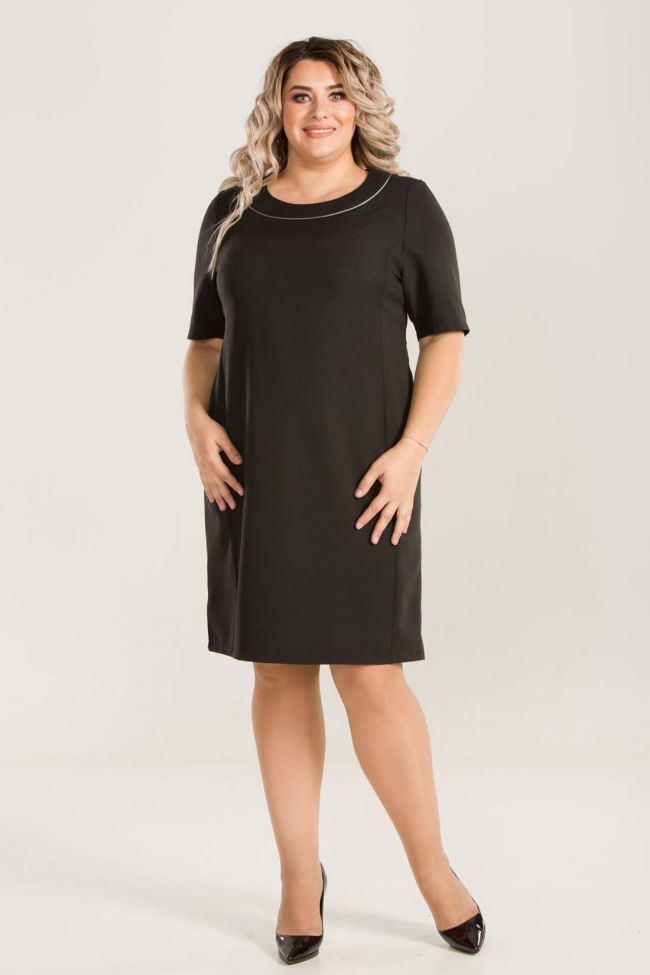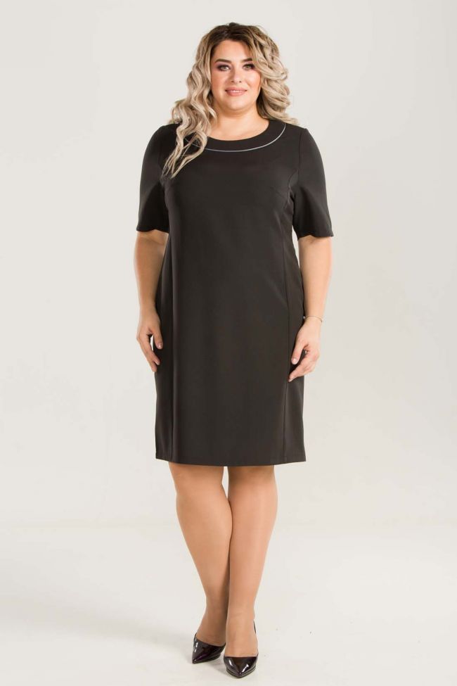 черный Деловое платье полуприлегающего  силуэта из костюмной ткани. Круглый вырез горловины  обработан широкой обтачкой с кантом. Перед с вертикальными рельефами и вытачкой по груди. Спинка разрезная, для свободы движений в шве  расположена шлица. Укороченный втачной рукав. Низ ровный.  Отличный вариант для дополнения Вашего офисного или повседневного гардероба.