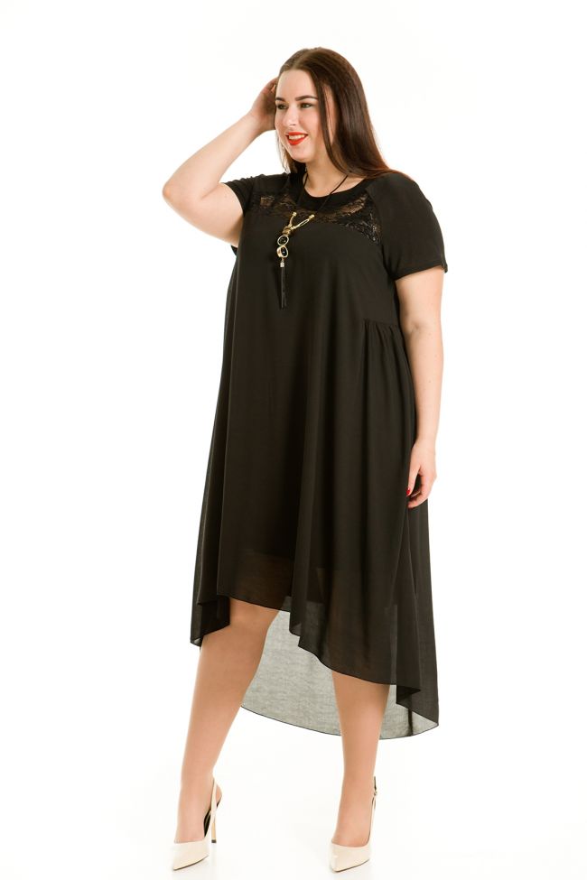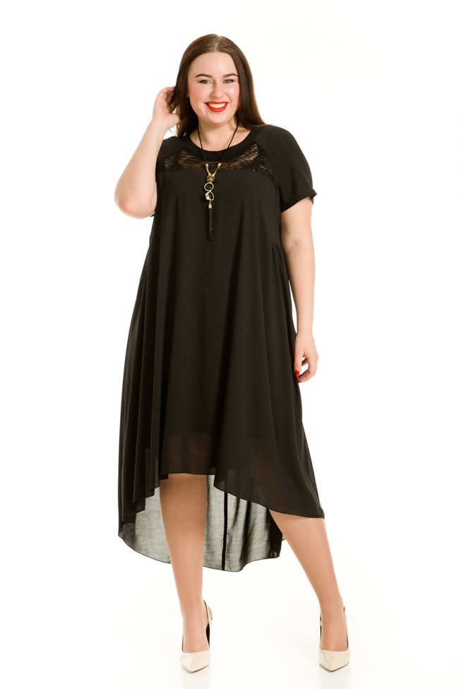 черный Очаровательное платье свободного силуэта из комбинированных тканей одного оттенка, на трикотажном подкладе. Основа -"креп шифон", кокетка переда - кружевное полотное.  Круглый вырез горловины обработан внешней обтачкой из пластичной ткани. Укороченные рукава -реглан, также выполнены из пластичного трикотажа "масло". По переду  горизонтальные подрезы в области талии, со сборкой по нижней детали. Спинка отрезная по линии талии, со сборкой по юбке. Низ ассиметричный. Платье зрительно удлиняет силуэт, прекрасно скрывает небольшие несовершенства и подчеркивает достоинства фигуры.