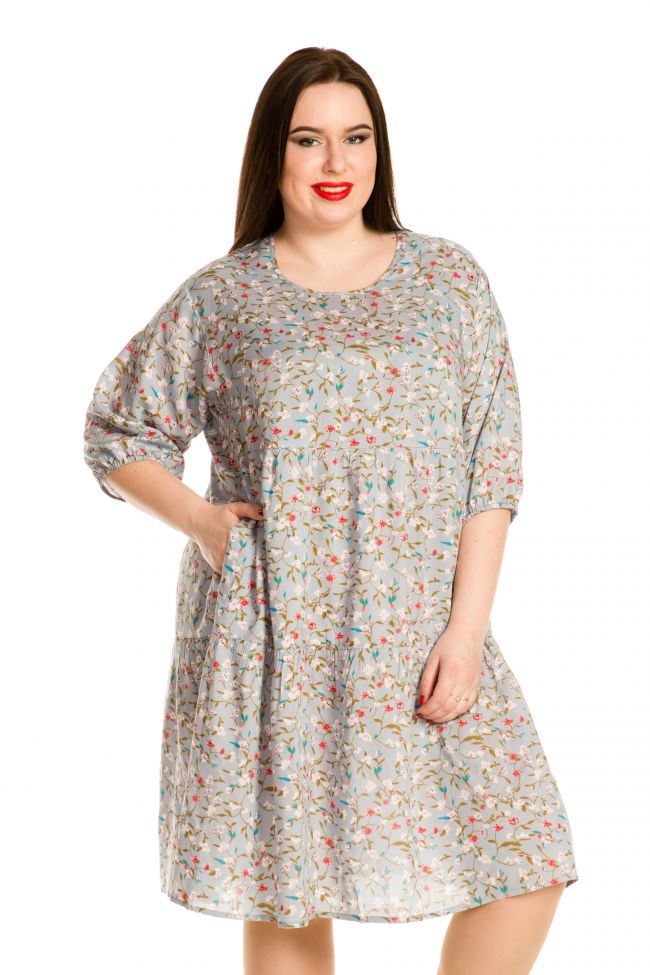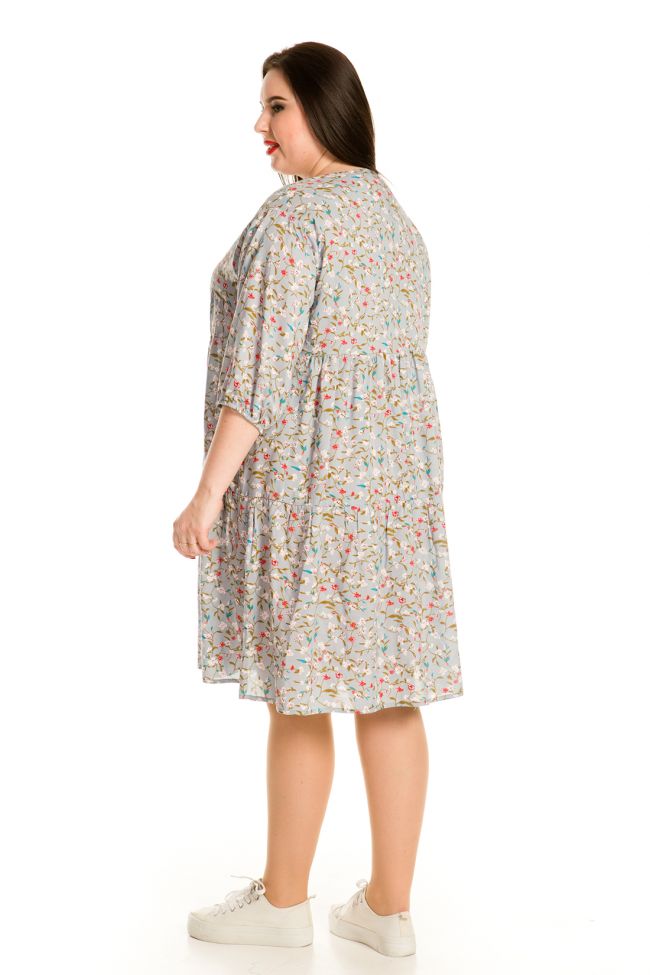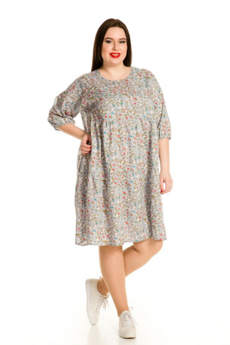 серый Комфортное платье свободного силуэта из штапельной ткани в мелкий цветочный принт. Спущенное плечо на прямоугольной пройме, укороченный рукав ¾, присборенный по низу на резинку. Круглый вырез горловины обработан окантовкой. Горизонтальные подрезы по переду и спинке дополнены мелкой сборкой. В боковом шве расположены карманы. Низ ровный, расклешен,без разрезов. Платье обеспечит свободу движений и поможет создать легкий повседневный образ.