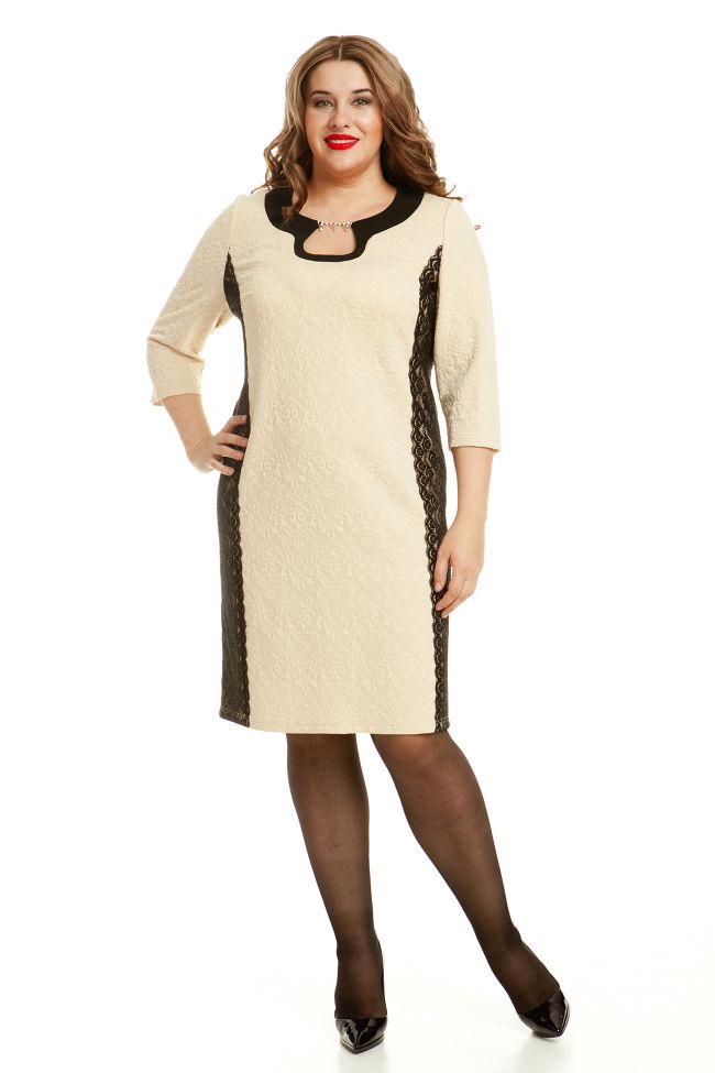 бежевый Женственное платье из однотонного трикотажного полотна. Каждая деталь этого изделия направлена на то, чтобы подчеркнуть силуэт Вашей фигуры и придать ей стройность: сочетание черно-белого цвета, декорирование плотным черным кружевом, классическая длина до колена, фигурная кокетка горловины. В этом платье Вы будете элегантны и романтичны, где бы Вы в нем не были - на корпоративной вечеринке или в театре.