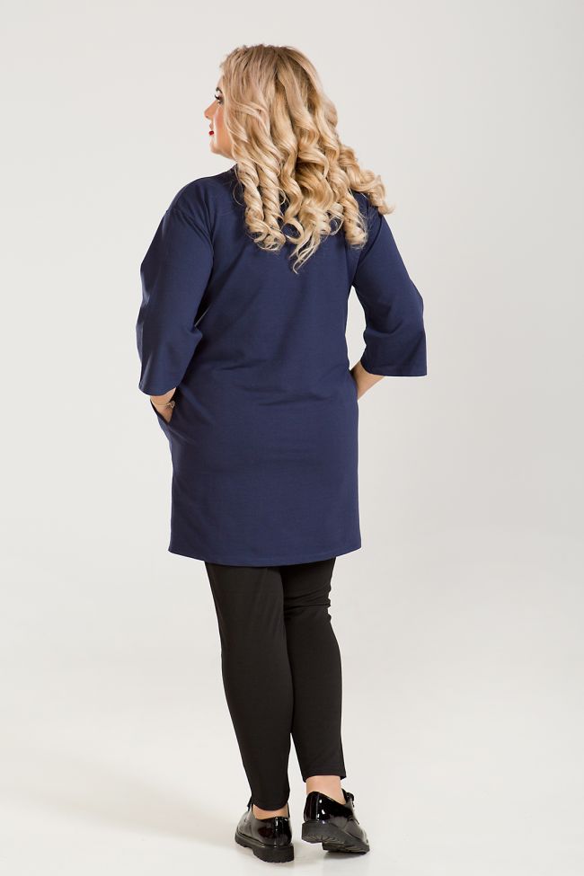 темно-синий Притягательное платье-туника прямого силуэта из хлопкового трикотажного полотна - футера. Круглый вырез горловины обработан притачной окантовкой, оставляет место под эффектное украшение. Втачные рукава длиной 3/4. Перед изделия декорирован крупными накладными карманами. По низу переда аккуратная притачная манжета. В этом платье Вы будете выглядеть женственно и нарядно.