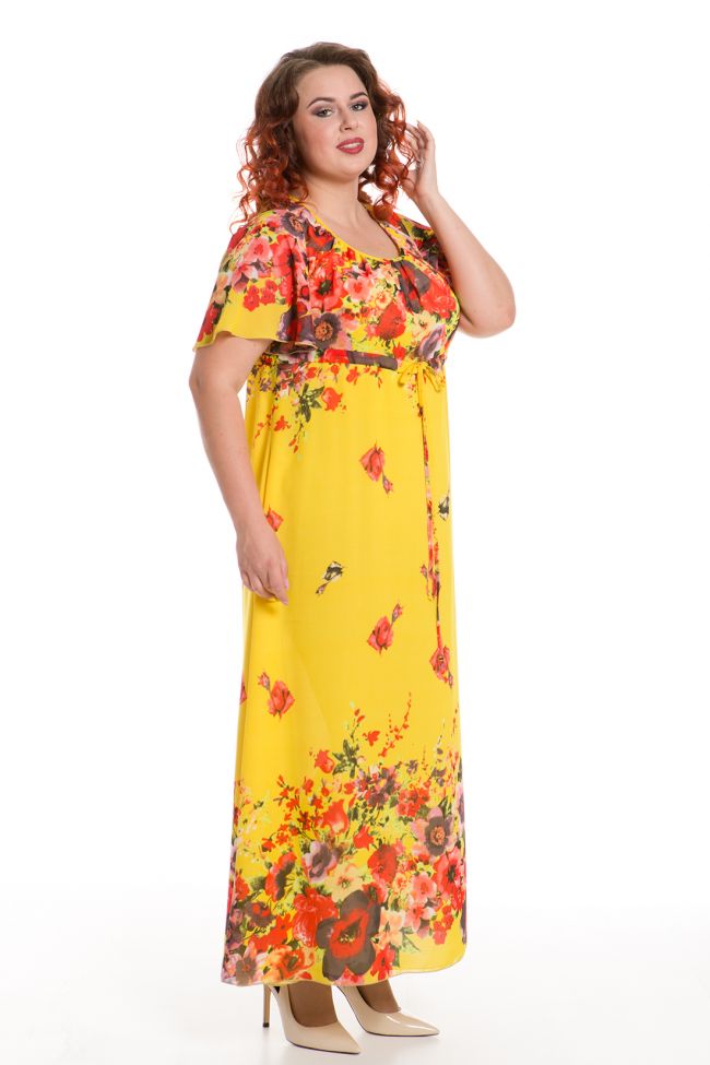 желтый Романтичное длиное платье полуприлегающего силуэта из воздушного, яркого, цветочного шифона. Полупрозрачность шифона приглушена вторым слоем ткани. Круглый вырез горловины обработан кантом и украшен мелкой сборкой. Свободные рукава деликатно прикрывают верхнюю часть рук. Платье отрезное под грудью, дополнено регулируемой кулиской. Модель зрительно скорректирует силуэт и подарит восторженные взгляды окружающих. Отличный вариант для торжественного дня или вечерней прогулки.