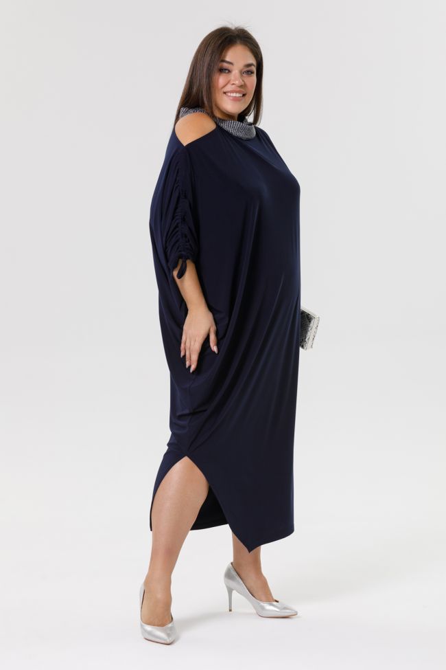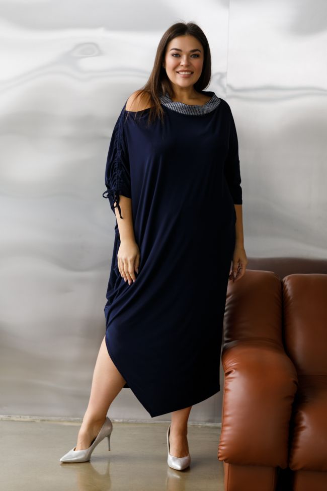 темно-синий Эффектное длинное платье оригинального кроя и свободного силуэта или Over size - означает, что изделие имеет более свободный крой и больший объем, чем обычные размеры одежды. Часто используется в моде, чтобы создать расслабленный и неформальный образ. изделие может достаточно хорошо садится на людей разного размера и роста. Модель выполнена из пластичного трикотажа «Масло». Левая сторона со спущенной линией плеча и рукавом за линию локтя. Правая сторона платья кроя «летучая мышь», с открытым плечом, дополненным стяжкой.В левом боковом шве удобный карман. Круглый вырез горловины оформлен стойкой с отделочной ткани. Низ изделия асимметричный, правая сторона с фигурным разрезом. Отличный вариант для торжественного выхода.