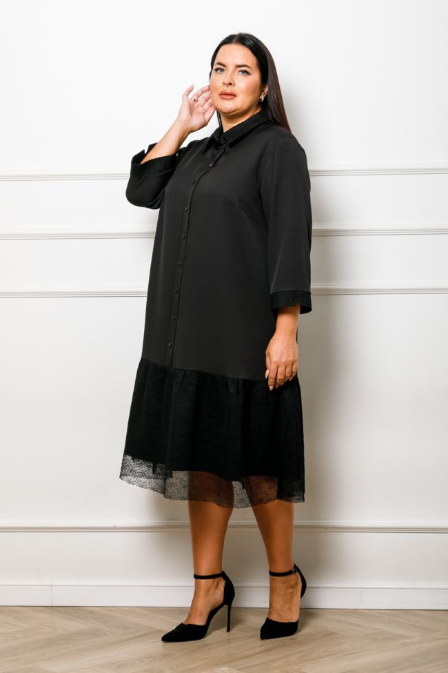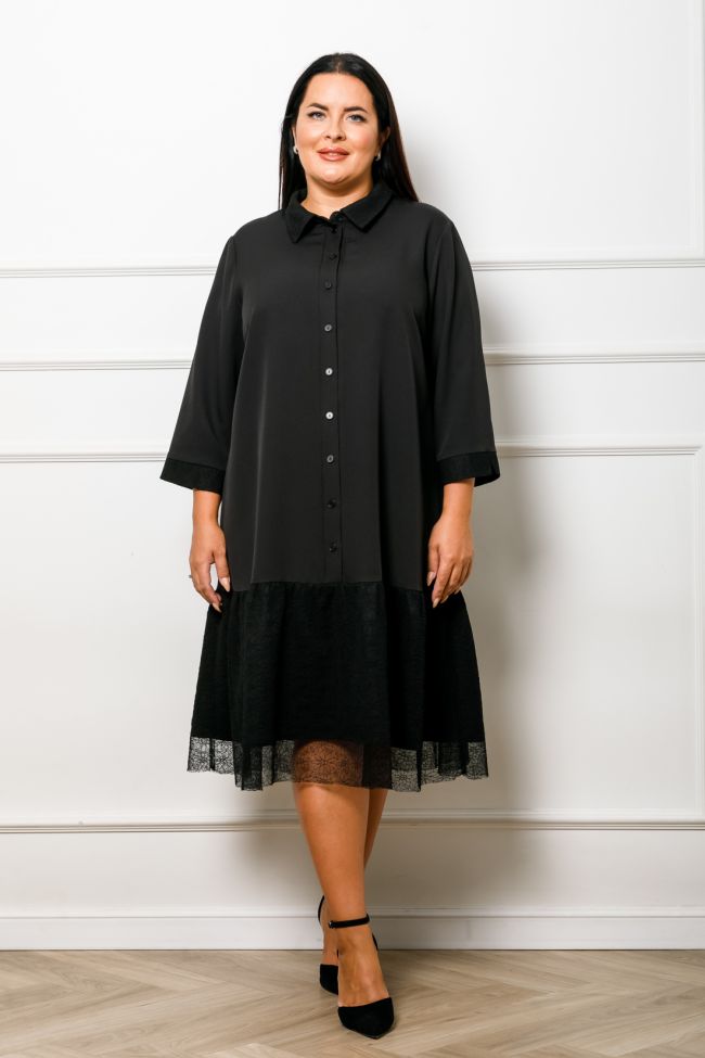 черный Комфортное платье свободного силуэта из плательной ткани с кружевом. Горизонтальные подрезы по переду и спинке - дополнены широкой оборкой. Воротник рубашечного типа. По центру переда - застежка на петли и пуговицы.  Рукав 7/8 втачной, по низу на манжете. Низ ровный. Крой платья отлично подойдет дамам с любым типом фигуры. Платье отлично будет смотреться в торжественной обстановке.